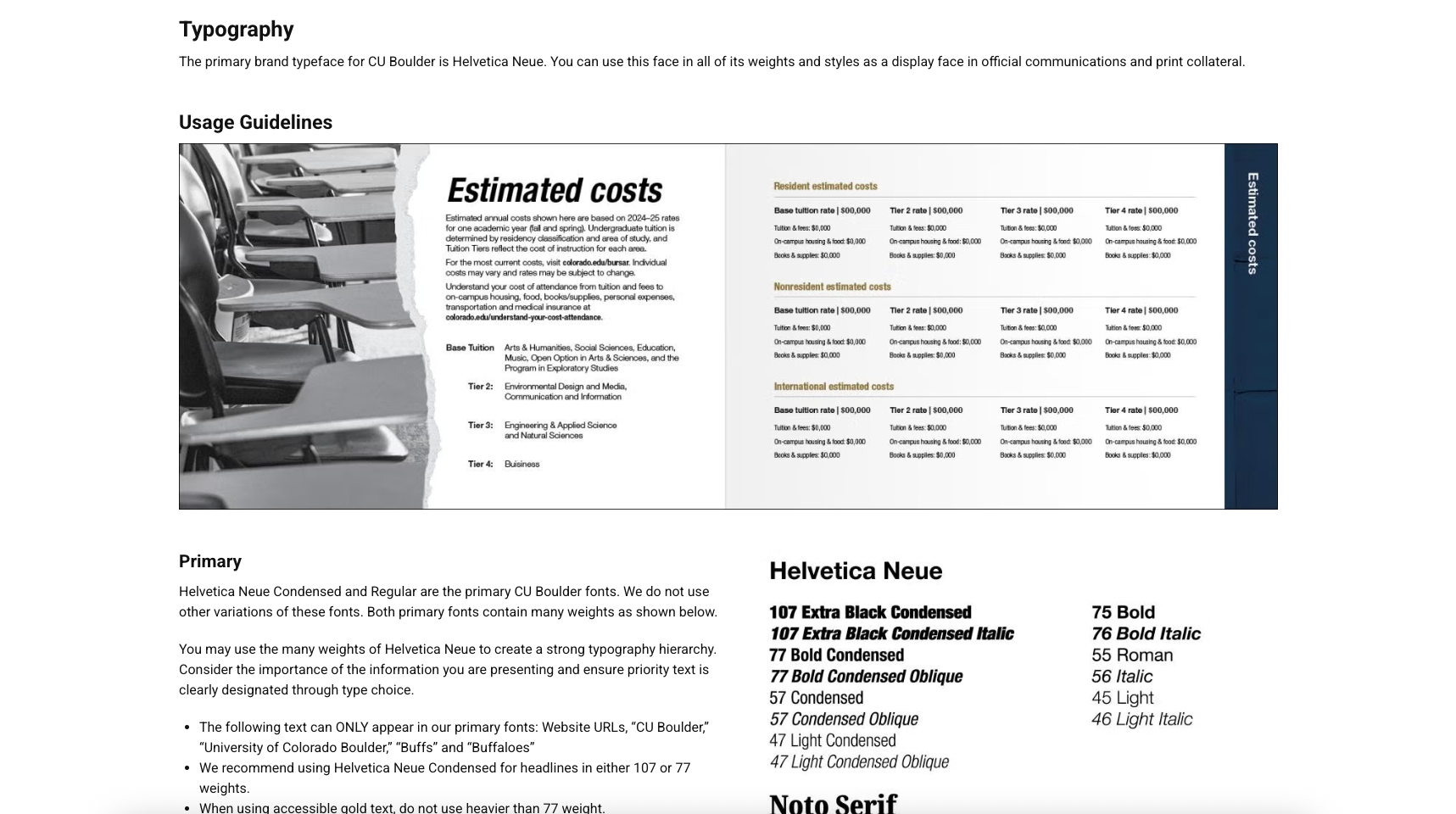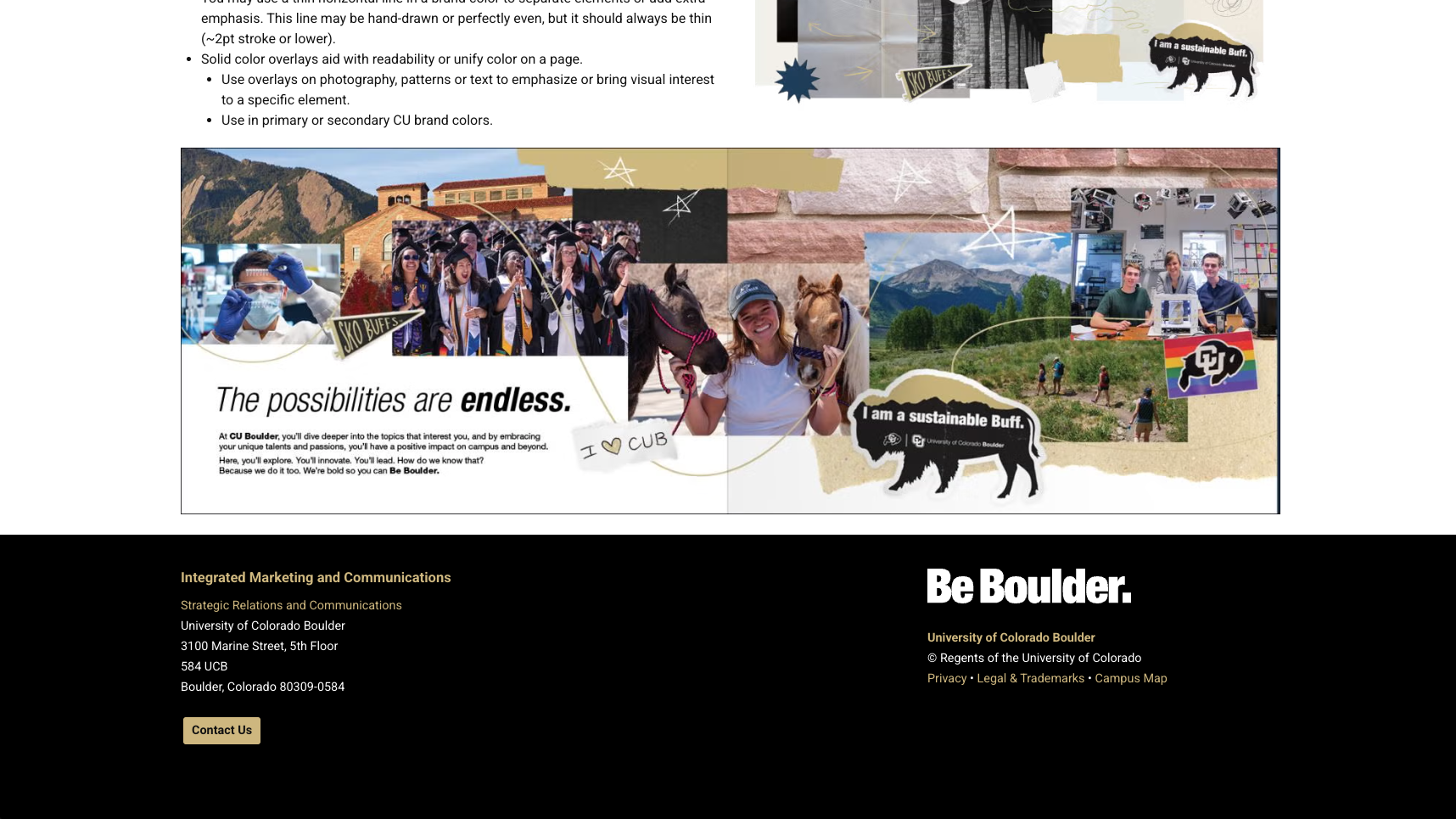 All refreshed guidelines were compiled into in one document that was used to create the content for a new CU Boulder brand site. Refreshing the site was a collaborative effort between writers, graphic designers, and UI/UX designers.