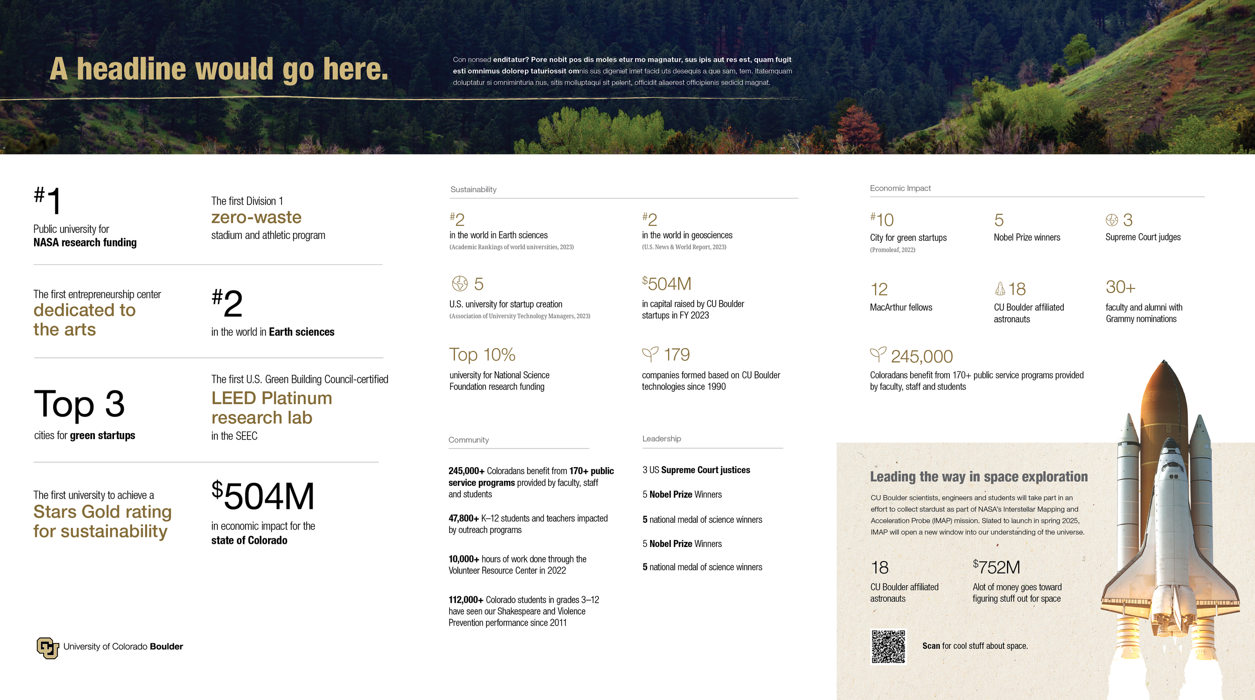 The CU Boulder brand refresh (2023–2025) made significant advances. Now CU Boulder’s visual identity represents the university’s mission, values, and brand character. Because the time and resources were invested in the brand refresh, all CU Boulder designers and content creators have the brand information, tools, and resources they need for success.
