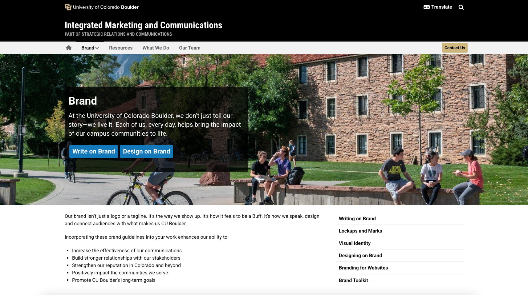 The CU Boulder brand site went through two iterations. In it’s current form, the site includes the most up-to-date brand information and examples, houses assets like photo galleries, video assets, and departmental lockups, and links to resources such as brand toolkits, website guidelines, and receiving brand support.
